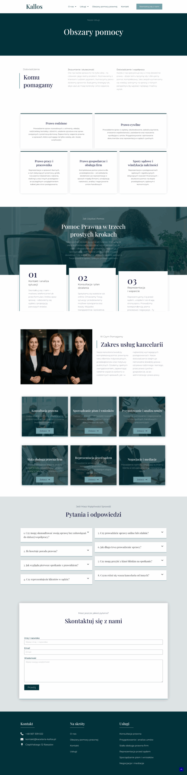 Strona opiera się na klarownej strukturze, która prowadzi użytkownika przez ofertę, sylwetki prawniczek oraz kluczowe obszary doradztwa. Zadbaliśmy o przemyślane rozmieszczenie treści, czytelny układ, a także dopracowany, stonowany wizerunek wizualny — wszystko to wspiera budowanie wiarygodności kancelarii w oczach odwiedzających.